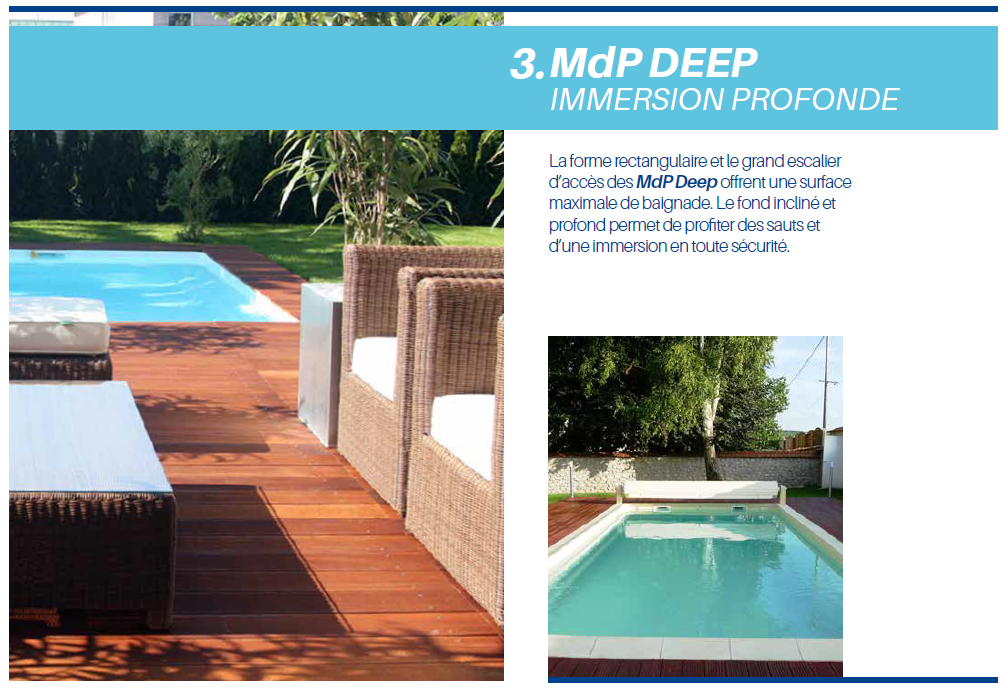 Son fond incliné et profond vous permet de plonger en toute sécurité. Munie d'un escalier antidérapant sur toute la largeur, la piscine DEEP permet aux petits comme aux grands de de profiter de la piscine.