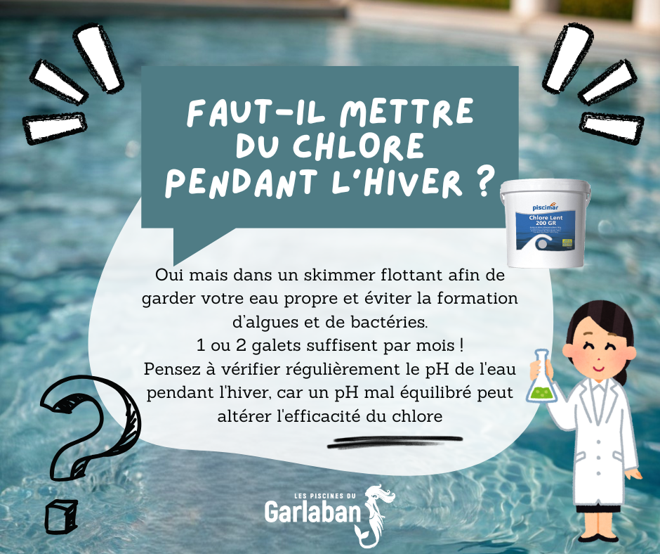 Oui mais dans un skimmer flottant afin de garder votre eau propre et éviter la formation d’algues et de bactéries. 1 ou 2 galets suffisent par mois ! Pensez à vérifier régulièrement le pH de l'eau pendant l'hiver, car un pH mal équilibré peut altérer l'efficacité du chlore