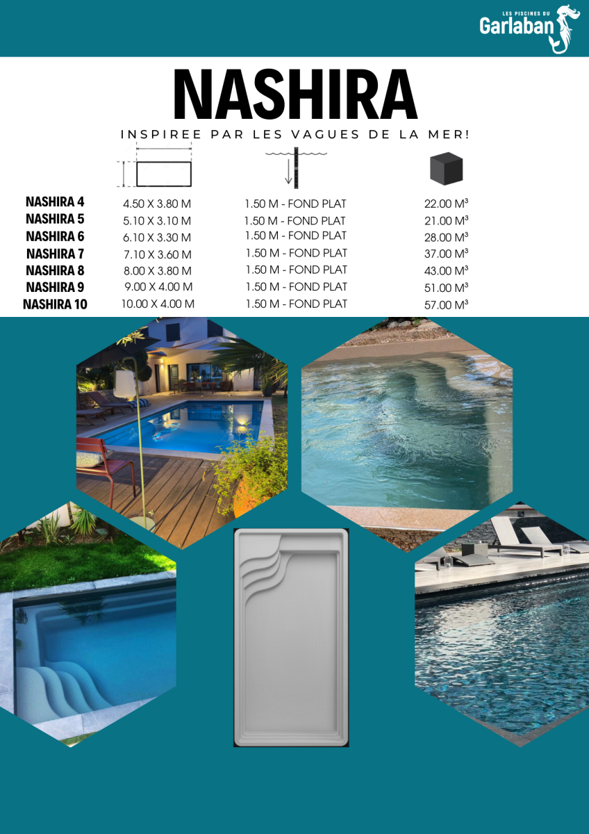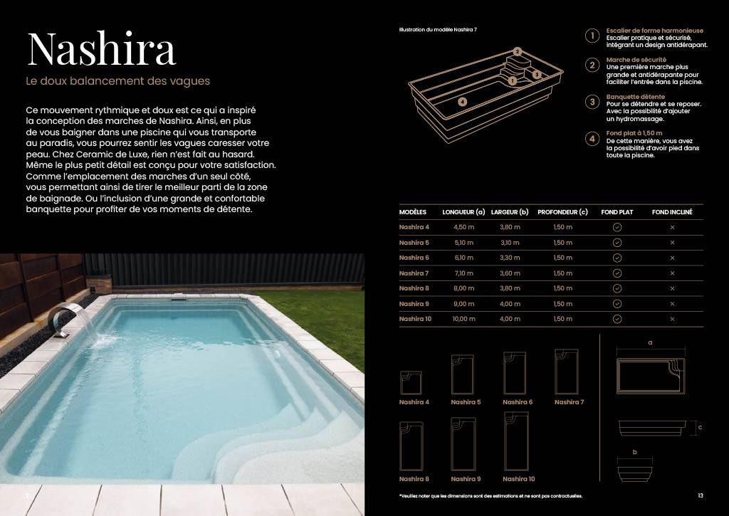 Inspirée du doux et rythmique des vagues, les marches de la Nashira vous transporte à chaque pas dans ce bassin paradisiaque. Conçus sur le côté afin de tirer le meilleur parti de la zone de baignade où l'inclusion d'une grande et confortable banquette vous permettra de profiter de moments de détente (avec la possibilité d'ajouter un hydromassage).
