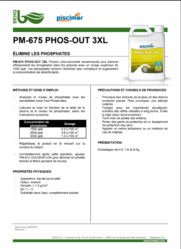 Phos Out 3XL de Piscimar est un produit conçu pour détruire les phosphates dans votre piscine si le taux est supérieur a 1000ppm.